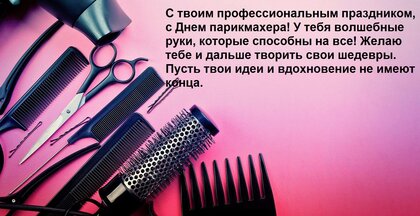 Открытки с днем парикмахера на неофициальный профессиональный праздник, который российские парикмахеры отмечают 13 или 14 сентября. Каждый профессиональный коллектив сам выбирает, в какой из двух дней им удобнее праздновать. Раньше профессиональным праздником парикмахеров считался День работников бытового обслуживания населения. Но со временем эта профессия вышла за рамки сферы услуг и заняла своего рода промежуточное положение между ремеслом и творчеством. Современные парикмахеры-стилисты не просто делают стрижки и укладки, а помогают человеку создать имидж с помощью прически.