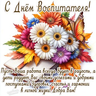 Открытки с днем воспитателя. Детский сад - особенно важный и ответственный период в жизни ребенка, в этом возрасте формируется личность, и закладываются основы здоровья. Благополучное детство и дальнейшая судьба каждого ребенка зависит от мудрости воспитателя, его терпения, внимания к внутреннему миру ребенка. С помощью своих воспитателей дошкольники познают секреты окружающего мира, учатся любить и беречь свою Родину. Мы поздравляем с праздником всех работников дошкольных учреждений, отдающих ежедневно тепло своих сердец детям! Мы уверены, что ваша доброта и педагогическое мастерство превратят каждый день для воспитанников в детском саду в день радости и счастья!
