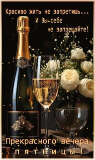 Открытки с наступающей и наступившей пятницей, поздравление с окончанием рабочей недели, пожелания удачной пятницы 13-го, и открытки с разнообразными фразами про пятницу. Все что связано с одним из самых любимых дней недели. Отправляйте своим друзьям поздравления с пятницей, радуйтесь, балдейте, расслабляйтесь и отрывайтесь. Ведь впереди выходные.