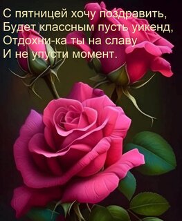 Открытки с наступающей и наступившей пятницей, поздравление с окончанием рабочей недели, пожелания удачной пятницы 13-го, и открытки с разнообразными фразами про пятницу. Все что связано с одним из самых любимых дней недели. Отправляйте своим друзьям поздравления с пятницей, радуйтесь, балдейте, расслабляйтесь и отрывайтесь. Ведь впереди выходные.