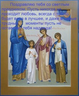 Открытки с днем Веры, Надежды, Любови и матери их Софьи. Вообще то это не праздник, а скорее памятная дата. Вера, Надежда и Любовь - это три маленькие девочки 12, 10 и 9 лет. Они верили в Христа, так же как и их мать София. Царствовавший в то время в Риме император Адриан пытался убедить семью отречься от веры - сначала уговорами, а потом пытками. Все его усилия оказались тщетными. Девочки умерли в муках, но не отреклись от Христа. Своим поступком они показали, что можно обладать великой силой духа даже при отсутствии большой физической силы. Вера, надежда и любовь - не только имена - это еще и названия трех главных христианских добродетелей, которые должны присутствовать в каждой счастливой семье. В современном мире молодые пары стараются сыграть в этот день свадьбу. А девочек родившихся в этот день называют Вера, Надежда или Любовь - считается, что они будут пользоваться особым покровительством святых.