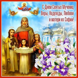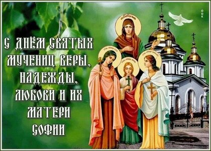 Открытки с днем Веры, Надежды, Любови и матери их Софьи. Вообще то это не праздник, а скорее памятная дата. Вера, Надежда и Любовь - это три маленькие девочки 12, 10 и 9 лет. Они верили в Христа, так же как и их мать София. Царствовавший в то время в Риме император Адриан пытался убедить семью отречься от веры - сначала уговорами, а потом пытками. Все его усилия оказались тщетными. Девочки умерли в муках, но не отреклись от Христа. Своим поступком они показали, что можно обладать великой силой духа даже при отсутствии большой физической силы. Вера, надежда и любовь - не только имена - это еще и названия трех главных христианских добродетелей, которые должны присутствовать в каждой счастливой семье. В современном мире молодые пары стараются сыграть в этот день свадьбу. А девочек родившихся в этот день называют Вера, Надежда или Любовь - считается, что они будут пользоваться особым покровительством святых.