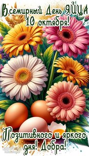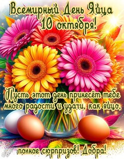 Открытки со всемирным днем яйца. Целью празднования Всемирного дня яйца является повышение осведомленности населения планеты о пользе яиц для здоровья человека. Чтобы отметить этот день, в разных городах проводятся кулинарные шоу, в которых из яиц готовят удивительные блюда, различные соревнования с использованием яиц, и конечно же отправляют открытки с изображением яиц.
