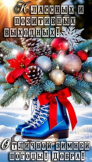 Открытки с пожеланиями хороших, классных, отличных выходных. Разнообразные пожелания провести отлично выходные. Смешные, забавные, милые, красивые, романтичные, шикарные открытки. На любой вкус цвет, пол и возраст. Открытки в стихах и прозе, на любое время года и период месяца. Вообщем огромная коллекция открыток для выходных дней.