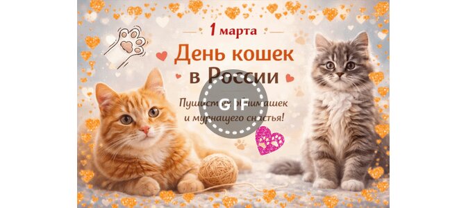 Анимированная открытка "1 марта. День кошек в России. Пушистых обнимашек и мурчащего счастья!"