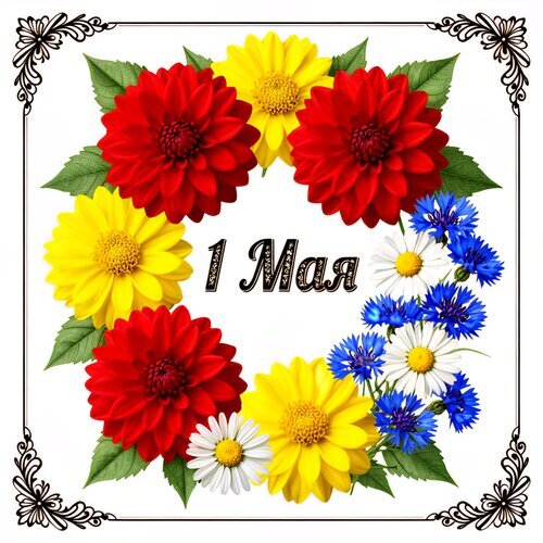 Красочная праздничная иллюстрация к 1 Мая в виде цветочного венка. Композиция включает яркие красные и желтые цветы, нежные белые ромашки и синие васильки. Декор обрамлен изящной черной рамкой с виньетками. Изображение идеально подходит для поздравлений с Первым мая, оформления открыток, праздничных постов в социальных сетях и тематического дизайна. Высокое качество, яркие цвета и весеннее настроение.