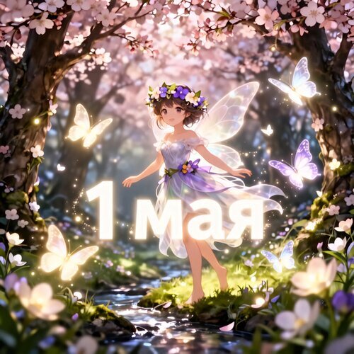 Сказочная цифровая иллюстрация в стиле аниме, посвященная 1 мая. На изображении запечатлена очаровательная маленькая фея с крыльями, украшенная цветочным венком, которая стоит посреди волшебного весеннего леса. Вокруг нее порхают светящиеся бабочки, а над потоком воды цветут нежно-розовые деревья сакуры. В центре композиции расположена крупная надпись «1 Мая», символизирующая наступление весны, пробуждение природы и праздник. Атмосфера наполнена светом, магией и праздничным настроением.