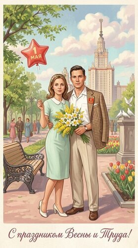 Советский ретро-постер, посвященный празднику Весны и Труда (1 Мая). На иллюстрации изображена молодая элегантная пара в парке на фоне сталинской высотки. Девушка в светлом платье держит букет желтых нарциссов и красный воздушный шар с надписью «1 МАЯ», а мужчина в классическом костюме и клетчатом пиджаке стоит рядом. Атмосфера залитого солнцем весеннего дня, цветущие тюльпаны, скамейка и прогуливающиеся люди создают ностальгическое настроение советской эпохи. Внизу каллиграфическая надпись на русском языке: «С праздником Весны и Труда!»