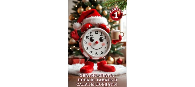 Открытка "1 ЯНВАРЯ. ХВАТИТ СПАТЬ, ПОРА ВСТАВАТЬ И САЛАТЫ ДОЕДАТЬ!"