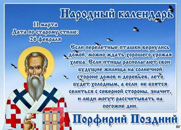 Народный календарь. 11 марта. Дата по старому стилю: 26 февраля. Если перелетные пташки вернулись домой, можно ждать хорошего урожая хлеба. Если птицы располагают свои будущие жилища на солнечной стороне домов и деревьев - лето будет холодным, а если не боятся селиться с северной стороны, значит, и люди могут рассчитывать на погожие дни. Порфирий Поздний
