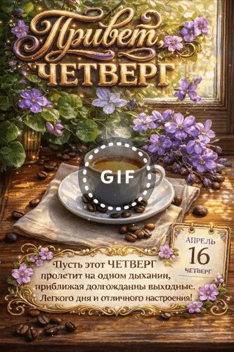 Анимированная открытка "16 апреля Привет, четверг. Пусть этот четверг пролетит на одном дыхании, приближая долгожданные"