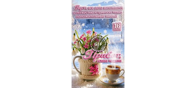 Анимированная открытка "16 февраля Привет, новая неделя! Пусть все дела выполняются с лёгкостью и приносят только положитель"
