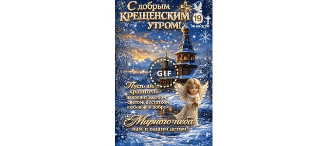Анимированная открытка "19 января С добрым Крещенским утром! Мирного неба вам и вашим детям! Пусть ангел-хранитель наполнит"