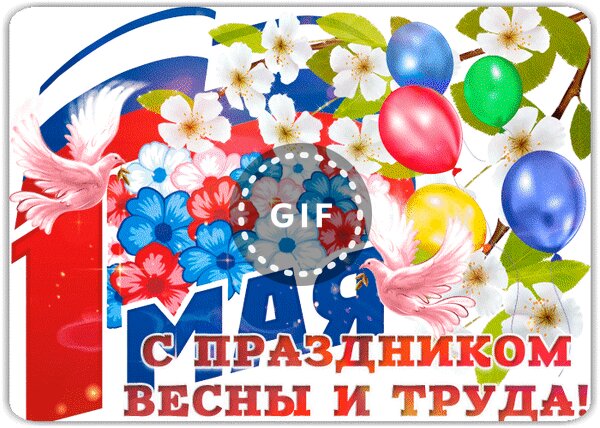 Праздничная открытка к 1 Мая — Дню Весны и Труда. Яркая композиция с крупной надписью «1 Мая! С праздником весны и труда!», украшенная нежными цветами вишни, голубыми и красными цветами, разноцветными воздушными шарами и летящими белыми голубями как символами мира. Солнечное и радостное изображение, идеально подходящее для поздравлений в социальных сетях и мессенджерах.