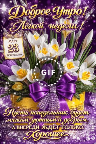 Анимированная открытка "23 марта Доброе утро! Лёгкой недели! Пусть понедельник будет мягким, уютным и добрым, а впереди ждёт"