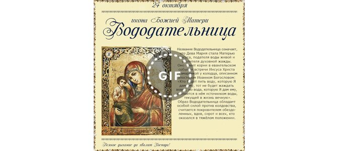 Анимированная открытка "24 октября Икона Божией Матери Вододательница. Название Вододательница означает, что Дева Мария стал"