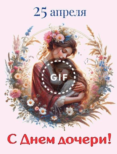 Красивая поздравительная открытка ко дню дочери, отмечаемому 25 апреля. На нежном фоне изображена любящая мать, нежно обнимающая свою маленькую дочь. Девушка украшена цветочным венком, а вся композиция обрамлена пышным венком из полевых цветов и колосьев. Иллюстрация выполнена в мягких, пастельных тонах, создавая атмосферу тепла, нежности и материнской любви. Идеально подходит для отправки в мессенджерах и социальных сетях как милое поздравление для мам и дочерей.