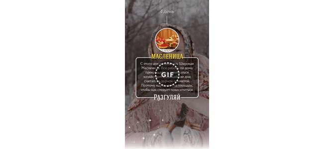 Анимированная открытка "4 день Масленица Разгуляй С этого дня начиналась Широкая Масленица. Все работы по дому прекращались"
