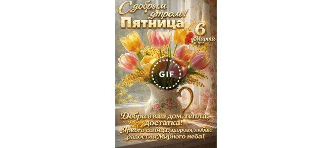 Анимированная открытка "6 марта. С добрым утром! Пятница. Добра в ваш дои, тепла, достатка. Яркого солнца, здоровья, любви,"