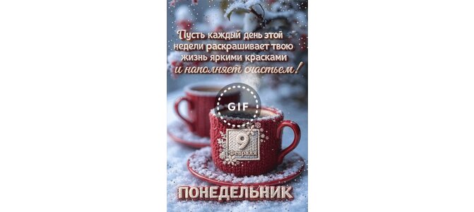 Анимированная открытка "9 февраля Понедельник Пусть каждый день этой недели раскрашивает твою жизнь яркими красками и"