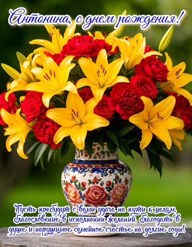 Красивая поздравительная открытка к дню рождения для Антонины. На изображении представлен пышный букет из ярко-желтых лилий и красных роз в изысканной расписной вазе. На открытке начертан теплый текст: «Антонина, с днем рождения!» и трогательное пожелание удачи, исполнения желаний, душевной благодати и крепкого семейного счастья на долгие годы. Идеально подходит для отправки в мессенджерах и социальных сетях для поздравления близкого человека.
