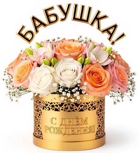 Красивый подарочный букет цветов в стильной золотой коробке с поздравительными надписями «Бабушка!» и «С днём рождения!». Композиция состоит из нежных персиковых и белых роз, дополненных мелкими цветами гипсофилы. Идеальный вариант для заказа цветов в подарок любимой бабушке на день рождения. Элегантный и теплый букет, который передаст вашу любовь и заботу.