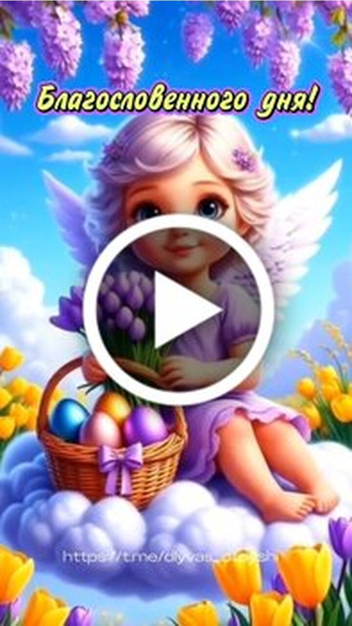 Красивое видео с милым маленьким ангелом в окружении фиолетовых цветов и облаков. Малыш-ангел держит корзину с яркими цветами и пасхальными яйцами на фоне сказочного храма. Видео наполнено добрыми пожеланиями благословенного дня Божьей помощи и защиты. В завершение звучат слова пожелания мира радости благодати и света в душе. Это идеальное видео для того чтобы подарить близким светлое настроение и духовное утешение.