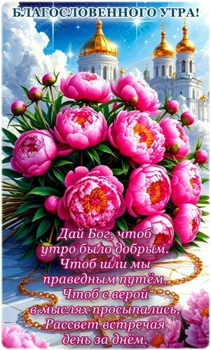 Красивая поздравительная открытка на доброе утро. На изображении представлен пышный букет ярко-розовых пионов на фоне величественных золотых куполов православного храма под светлым голубым небом. На картинке наложен текст с добрыми пожеланиями и духовным напутствием: «Дай Бог, чтоб утро было добрым. Чтоб шли мы праведным путем. Чтоб с верой в мыслях просыпались, Рассвет встречая день за днём». Идеально подходит для отправки близким, друзьям и в религиозные группы в социальных сетях для создания светлого настроения и духовного вдохновения с самого утра.
