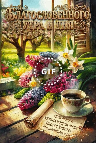 Красочная поздравительная открытка с пожеланием благословенного утра и дня. На изображении представлен пышный букет весенних цветов: гиацинтов розового и синего цвета, а также белых нарциссов. Композиция дополнена чашкой ароматного кофе на деревянном столе и свитком с библейской цитатой из Филиппийцам 4:13: «Все могу в укрепляющем меня Иисусе Христе». Фон с цветущими деревьями и солнечным светом создает атмосферу уюта, веры и весеннего обновления. Идеально подходит для христианских поздравлений и духовного вдохновения.