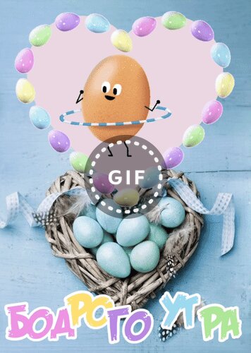 Веселая пасхальная открытка с мультяшным персонажем — антропоморфным яйцом, которое крутит хула-хуп. Персонаж находится внутри сердца, обрамленного разноцветными пасхальными яйцами. В нижней части композиции расположена плетеная корзинка в форме сердца, наполненная голубыми яйцами, украшенная лентами. На переднем плане крупная надпись на русском языке «БОДРОГО УТРА» в ярком праздничном стиле. Изображение выполнено в светлых пастельных тонах на голубом деревянном фоне, создавая радостное весеннее настроение.