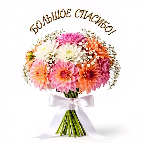 Красивый и пышный букет из ярких георгинов в розовых, оранжевых и белых тонах, дополненный нежной гипсофилой. Букет перевязан элегантной белой атласной лентой и представлен на чистом белом фоне. Сверху расположена стильная надпись на русском языке «БОЛЬШОЕ СПАСИБО!», что делает изображение идеальным для открытки, благодарственной записки или поздравления в социальных сетях. Композиция передает радость, теплоту и искреннюю признательность.