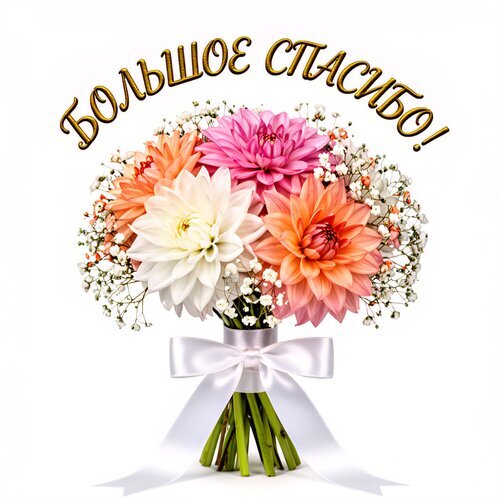 Красивый и нежный букет из ярких георгинов (розовых, оранжевых и белых) в сочетании с воздушной гипсофилой. Букет перевязан элегантной белой атласной лентой. Сверху расположена золотистая надпись на русском языке «БОЛЬШОЕ СПАСИБО!». Изображение выполнено на чистом белом фоне, идеально подходит для использования в качестве поздравительной открытки, цифрового сообщения с благодарностью или элемента оформления праздничного дизайна.