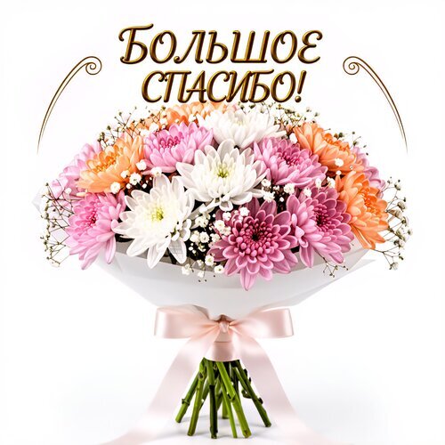 Красивый и пышный букет из разноцветных хризантем в нежной цветовой гамме: розовые, белые и оранжевые оттенки. Цветы дополнены мелкими белыми гипсофилами и перевязаны атласной розовой лентой. В верхней части изображения расположена надпись золотистыми буквами «БОЛЬШОЕ СПАСИБО!». Идеальное изображение для открытки, поздравительной открытки или сообщения в знак благодарности. Высокое качество, чистый белый фон.
