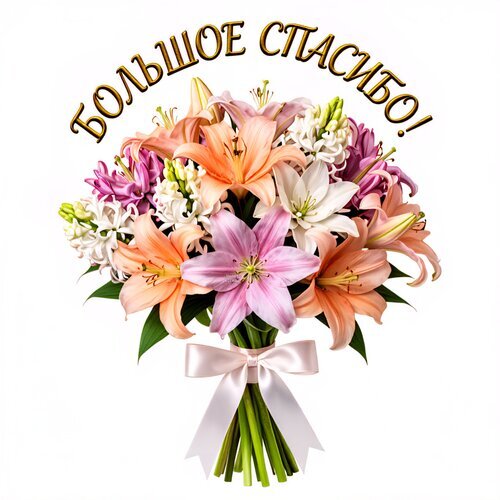 Красочный и пышный букет из разнообразных лилий в нежных оттенках розового, персикового и белого цветов. Цветы перевязаны элегантным атласным бантом светло-розового цвета. Над букетом расположена надпись золотистыми буквами с объемным эффектом «БОЛЬШОЕ СПАСИБО!». Изображение выполнено на чистом белом фоне, что делает акцент на яркости и свежести флористической композиции. Идеально подходит для использования в качестве поздравительной открытки, выражения благодарности или в качестве стоковой иллюстрации на тему признательности.