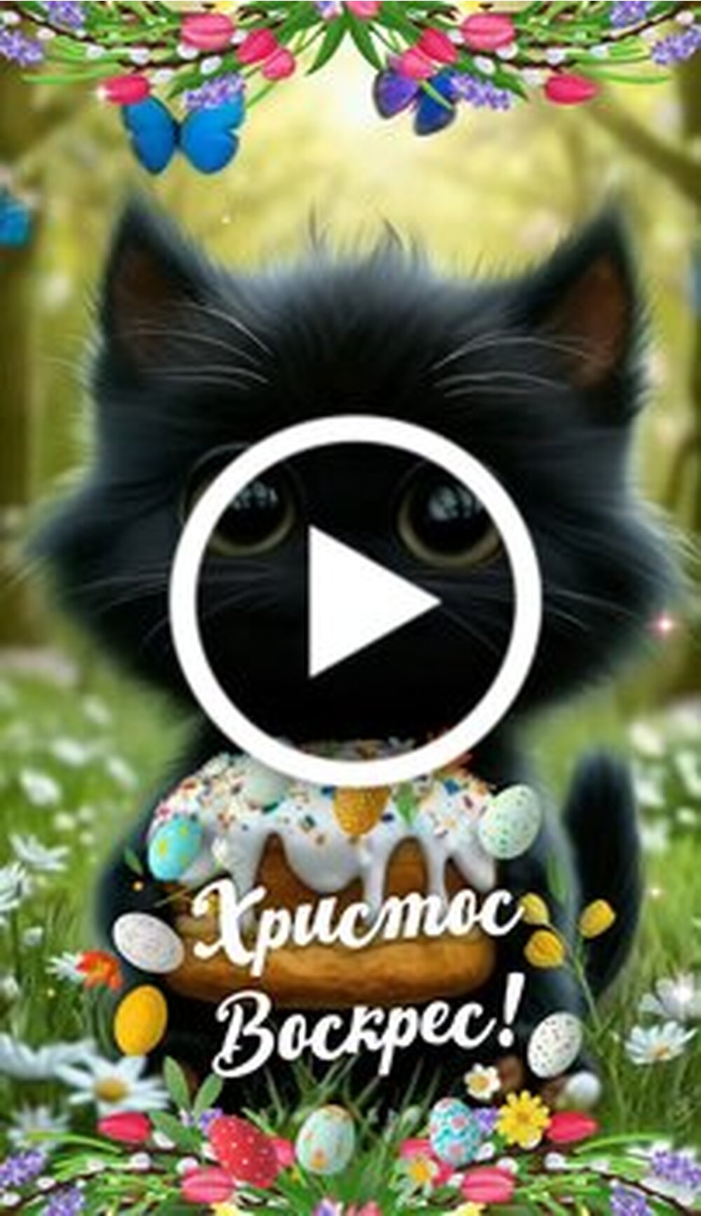 Милое видео с очаровательным черным котенком, который празднует Пасху в окружении весенних цветов и бабочек. Котенок держит праздничный пасхальный кулич и раскрашенные яйца, создавая атмосферу радости и тепла. В ролике звучат поздравления с Пасхой, пожелания насладиться куличом со сметаной и традицией битья крашеными яйцами. Видео завершается теплыми словами любви и нежными поздравлениями с Христoс Воскресе. Это идеальное праздничное видео для отправки друзьям и близким.
