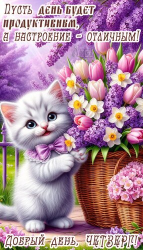 Теги:четверг, дни недели, котенок, позитива, цветы, сирень, тюльпаны, корзина цветов, красивая картинка, продуктивного дня, добра, добрый день