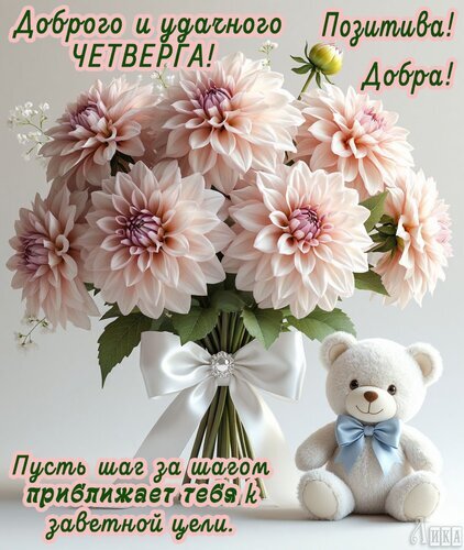 Теги:чевеверг, дни недели, добрый день, красивая картинка, добра, успехов, достижения целей, мишка, цветы, букет георгин, букет цветов, мишкаигрушка