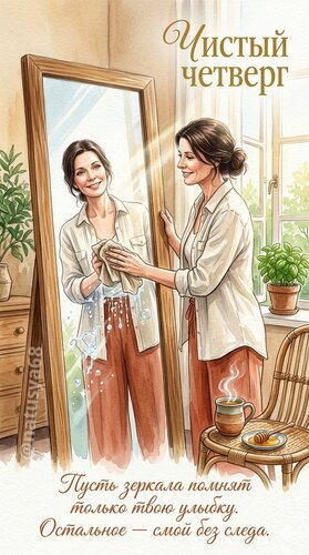 Открытка "Чистый четверг. Пусть зеркала помнят только твою улыбку. Остальное - смой без следа."
