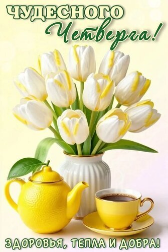 Красивая поздравительная открытка с букетом белых тюльпанов с желтыми полосками в белой вазе. Рядом расположены желтый чайник и чашка ароматного кофе или чая. На картинке надпись на русском языке: «Чудесного четверга!» сверху и «Здоровья, тепла и добра!» снизу. Светлая, солнечная и уютная композиция, идеально подходящая для отправки друзьям и близким в мессенджерах для поднятия настроения в четверг.