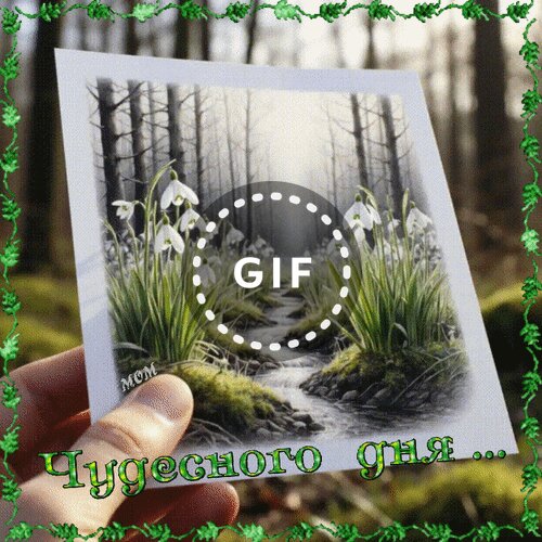 Красивая открытка с изображением весенних подснежников в лесу. На фото запечатлен момент, когда рука держит распечатанный снимок с нежными белыми цветами на фоне туманного леса и ручья. На переднем плане на русском языке нанесена надпись «Чудесного дня...». Изображение передает атмосферу пробуждения природы, свежести и весеннего настроения. Подходит для отправки в качестве доброго пожелания близким и друзьям в мессенджерах или социальных сетях.