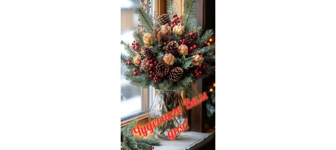 На подоконнике стоит стеклянная ваза с букетом из еловых веток с шишками