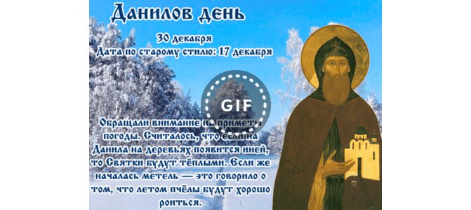 Данилов день 30 декабря. Дата по старому стилю: 17 декабря. Обращали внимание на приметы погоды. Считалось, что если на Данила на деревьях появится иней, то Святки будут тёплыми. Если же началась метель — это говорило о том, что летом пчёлы будут хорошо роиться.