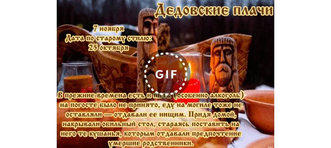 Дедовские плачи. 7 ноября. Дата по старому стилю: 25 октября. В прежние времена есть и пить (Особенно алкоголь) на погосте было не принято, еду на могиле тоже не оставляли - отдавали ее нищим. Придя домой, накрывали обильный стол, стараясь поставить на него те кушанья, которым отдавали предпочтение умершие родственники.