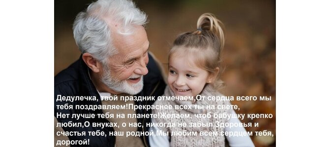 Теги:дедулечка, твой праздник отмечаем, от сердца всего мы тебя поздравляем прекраснее всех ты на свете, нет лучше тебя на планете желаем, чтоб бабушку крепко любил, о внуках, о нас, никогда не забыл, здоровья и счастья тебе, наш родной, мы любим всем сердцем тебя, дорогой