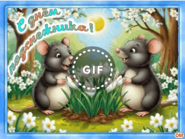 Милая мультяшная иллюстрация с двумя улыбающимися серыми мышками, которые радуются весне среди цветущих крокусов. На картинке изображены два симпатичных персонажа-грызуна в окружении белых цветов и деревьев под ярким солнечным небом. В верхней части изображения присутствует праздничная надпись на русском языке «С днём снежника!», что делает картинку идеальной для поздравительной открытки или тематического оформления. Теплые цвета, солнечный свет и весенняя атмосфера создают позитивное и радостное настроение.