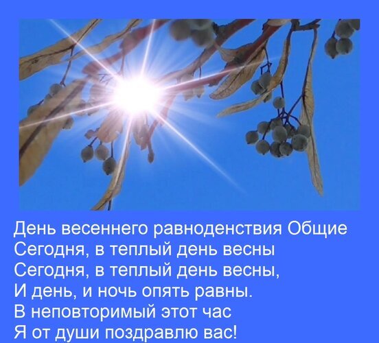 Теги:день весеннего равноденствия общие сегодня, в теплый день весны сегодня, в теплый день весны, и день, и ночь опять равны в неповторимый этот час я от души поздравлю вас