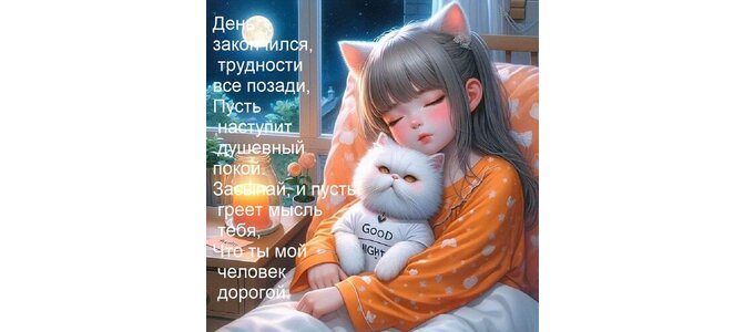Теги:день закончился, трудности все позади, пусть наступит душевный покой засыпай, и пусть греет мысль тебя, что ты мой человек дорогой