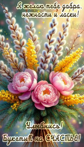 Теги:для тебя и от души, пионы, цветы, верба, мимоза, улыбнись, букетик на счастье, добра, нежности, ласки, красивая картинка, пожелания на каждый день, весна