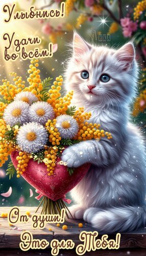 Теги:для тебя от души, котик, пушистик, сердечко, милота, цветы, мимоза, для тебя, удачи, весна, лето, красивая картинка, пожелания на каждый день