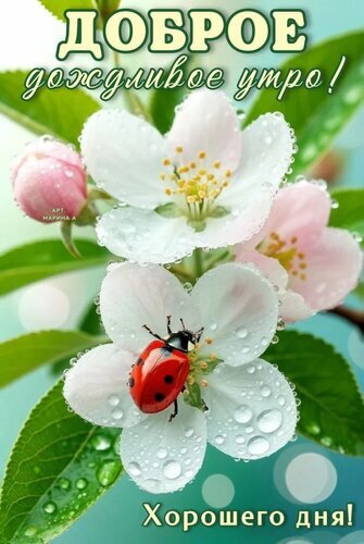 Красивая открытка с нежными белыми цветами яблони или вишни, покрытыми каплями ут��енней росы. На лепестке одного из цветов сидит яркая семиточечная божья коровка. На фоне видны зеленые листья и мягкое боке. В верхней части изображения расположена надпись на русском языке «ДОБРОЕ ДОЖДЛИВОЕ УТРО!», а в нижней — «Хорошего дня!». Изображение передает свежесть, уют и красоту природы после дождя. Подходит для отправки в мессенджерах и социальных сетях в качестве пожелания доброго утра.